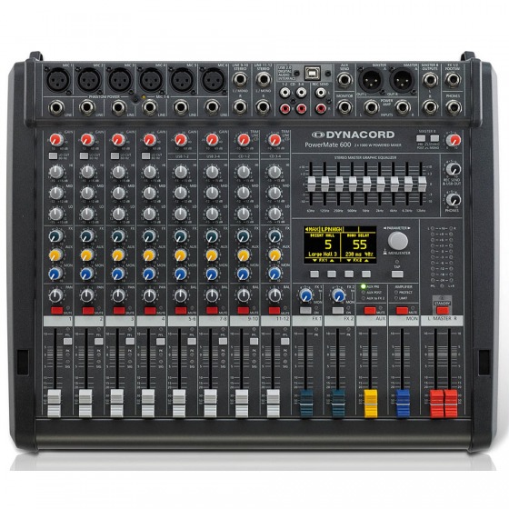 500-ваттный 12-канальный активный микшерный пульт с процессором эффектов и системой обнаружения обра ...